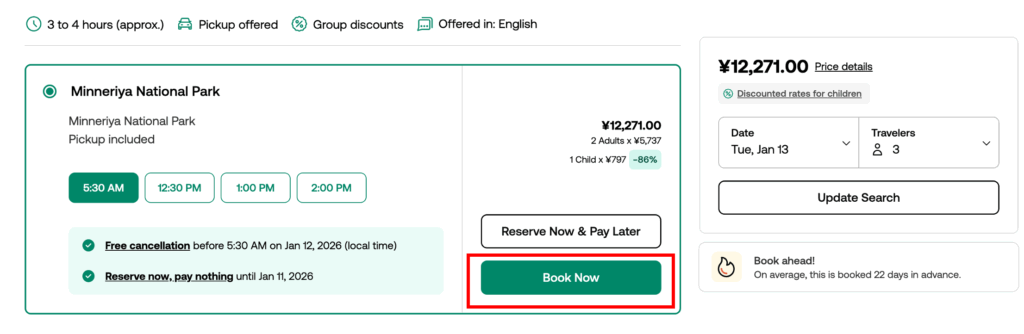 | Viator (Tripadvisor系) | プライベートジープ(朝/午後から選択)、ティッサマハラマ送迎など多数プラン | 多くのプランが24時間前まで無料キャンセル。入園料が別料金のプランも明記されており、含有/不含有の確認がしやすい。 (Viator) |